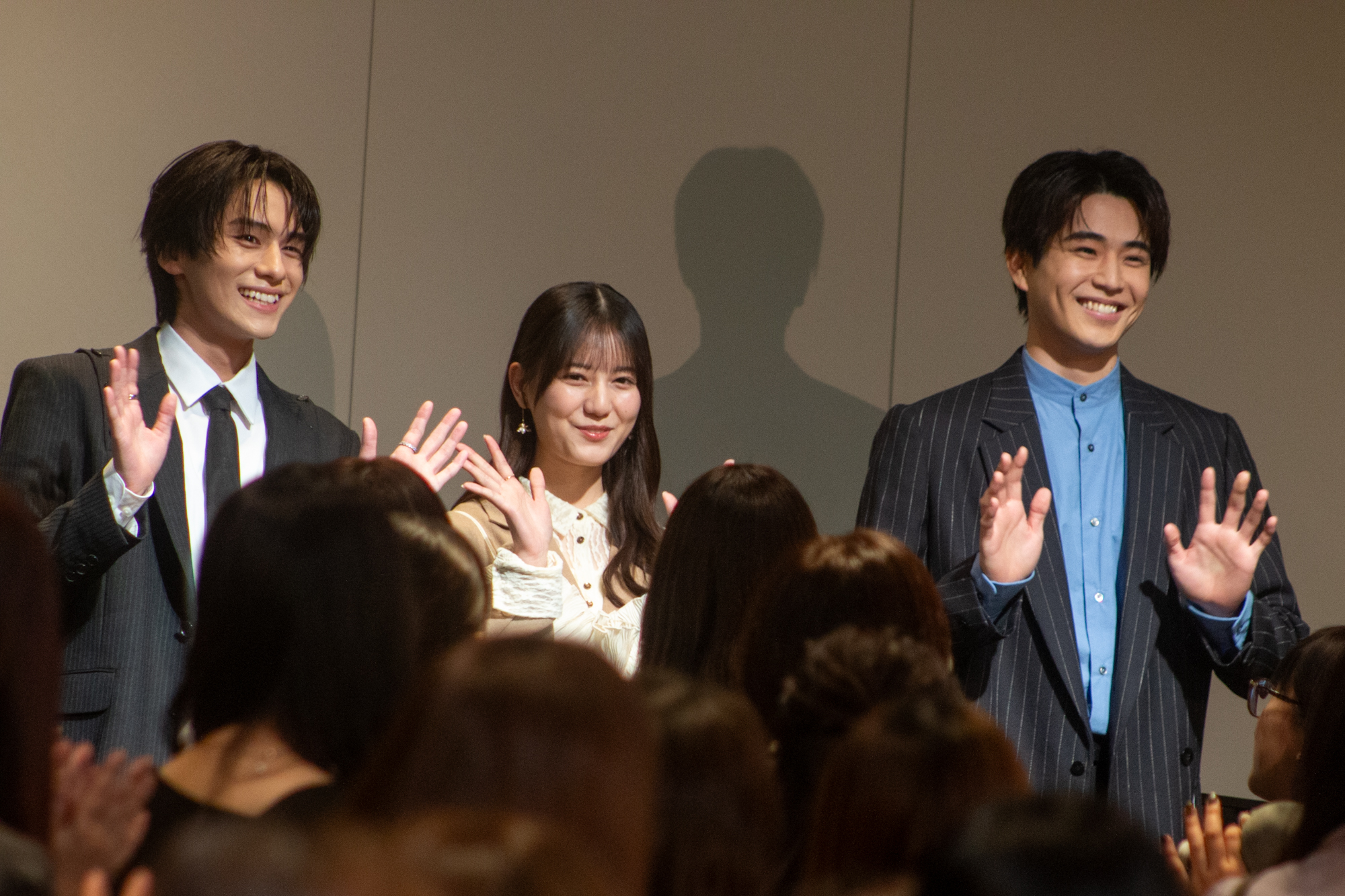 本作が初共演の高橋と伊野尾。「事務所の先輩の方とご一緒させていただくのが初めてだったので緊張していた」という高橋は「優しくしゃべりかけていただいて、拾っていただいた猫かのようにかわいがっていただきました」と明かし、伊野尾尾も「後輩の子とご一緒すること機会はそんなに多くないので、後輩と一緒だとすごく緊張しちゃって。初日にどういうテンションで挨拶したらいいいか分からなくて、とりあえず両手でキュッと手を握ってしまいました」と明かし、笑いを誘った。さらにMCからの挨拶のシーンをやってほしいというリクエストに応じて、高橋と伊野尾が挨拶を再現し、会場を沸かせtあ。