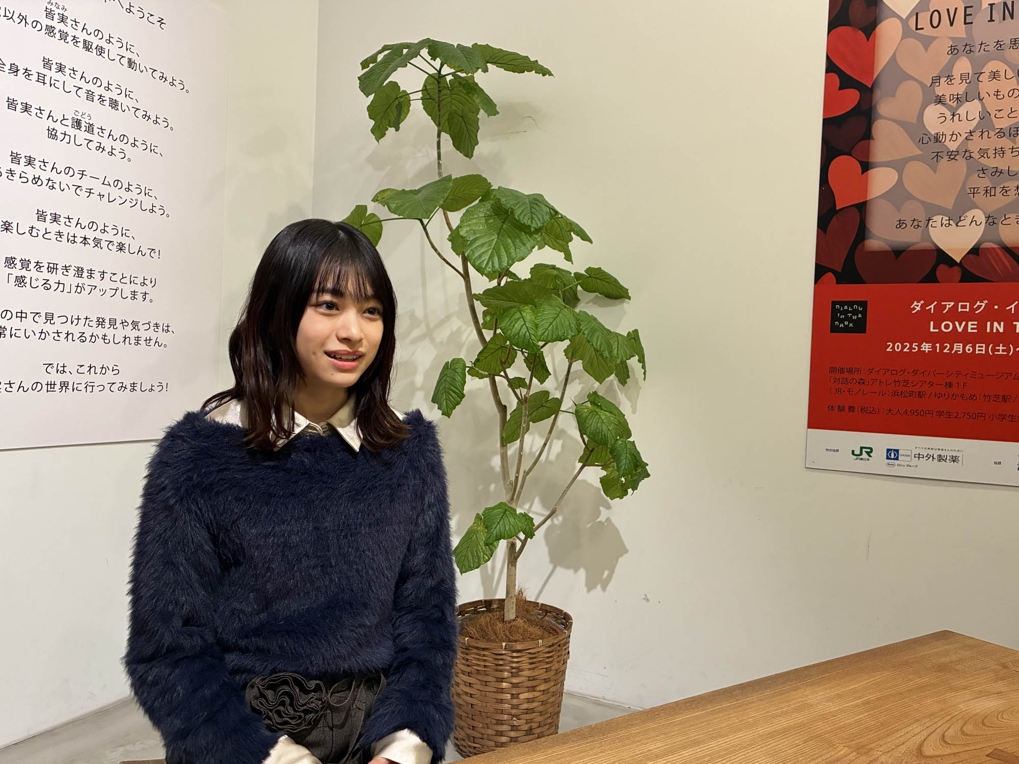 今回、皆実の初恋の人ナギサ・イワノワ(宮沢りえ)の娘で、皆実に助けを求めるニナを演じた月島琉衣が、本プログラムを体験した。「最初は暗闇の中に溶け込んでしまうような感覚に不安もありました」と、初めは緊張していたという月島。しかし、「一緒に参加した方々と暗闇の中で同じ時を過ごすうちに、だんだんと安心感が芽生え、絆が生まれてきました」と振り返りました。暗闇ならではの体験を聞かれると、「日頃は手を使わずとも見えるのでそこに何があるのか分かりますが、暗闇の中ではまず手の甲で触れてみたりなどして確かめていました。また、新たな発見もあり、プログラム内のカフェコーナーでリンゴジュースを飲んだのですが、暗闇の中の方が美味しく感じたのは驚きでした」とエピソードを披露。