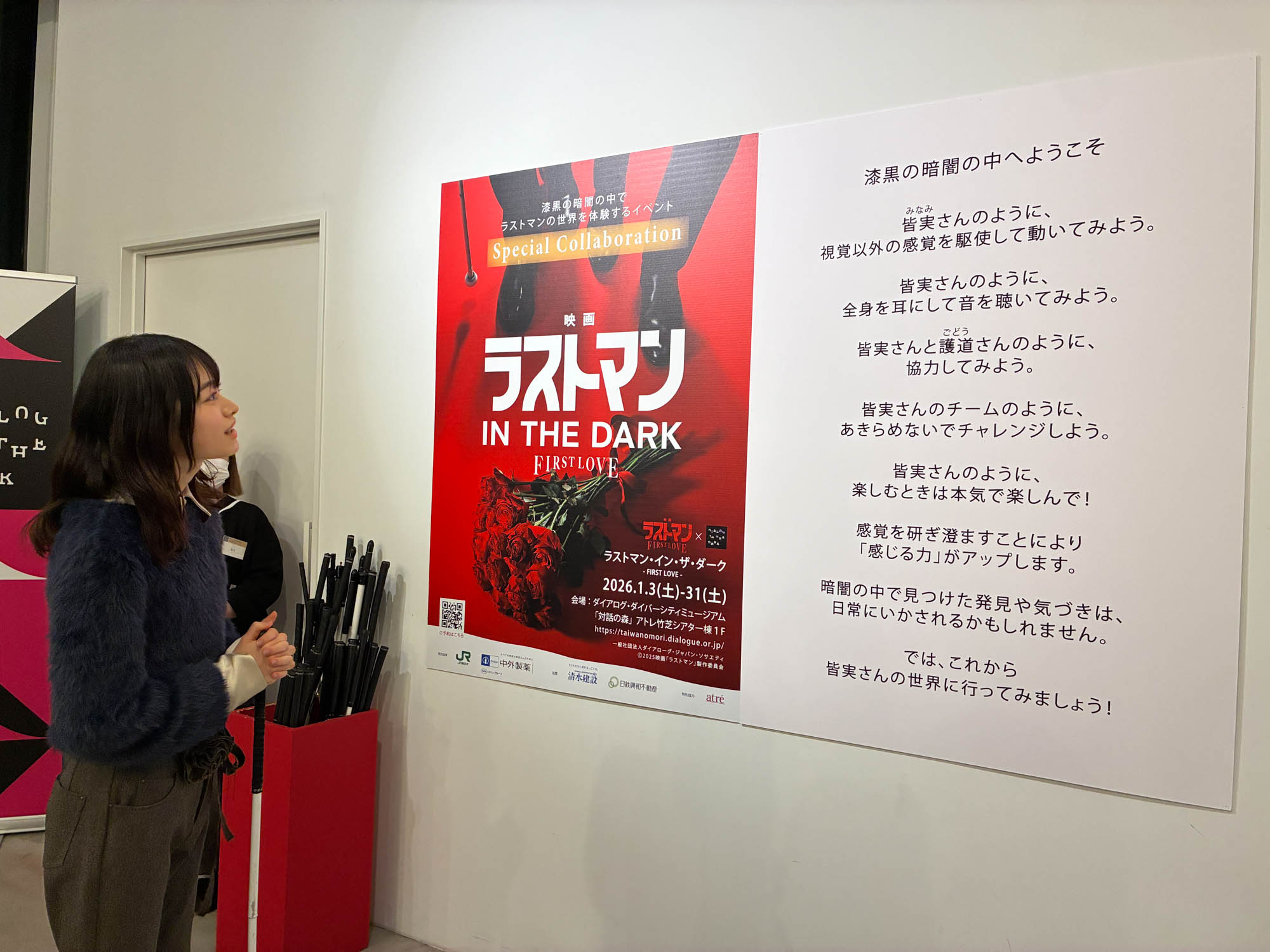 映画公開を記念して1月3日(土)~31日(土)の期間限定で、「ダイアログ・イン・ザ・ダーク」とタイアップ企画を実施。暗闇で視覚以外の感覚を使って皆実の世界を追体験できる特別プログラム「ラストマン・イン・ザ・ダーク –FIRST LOVE-」が開催されている。