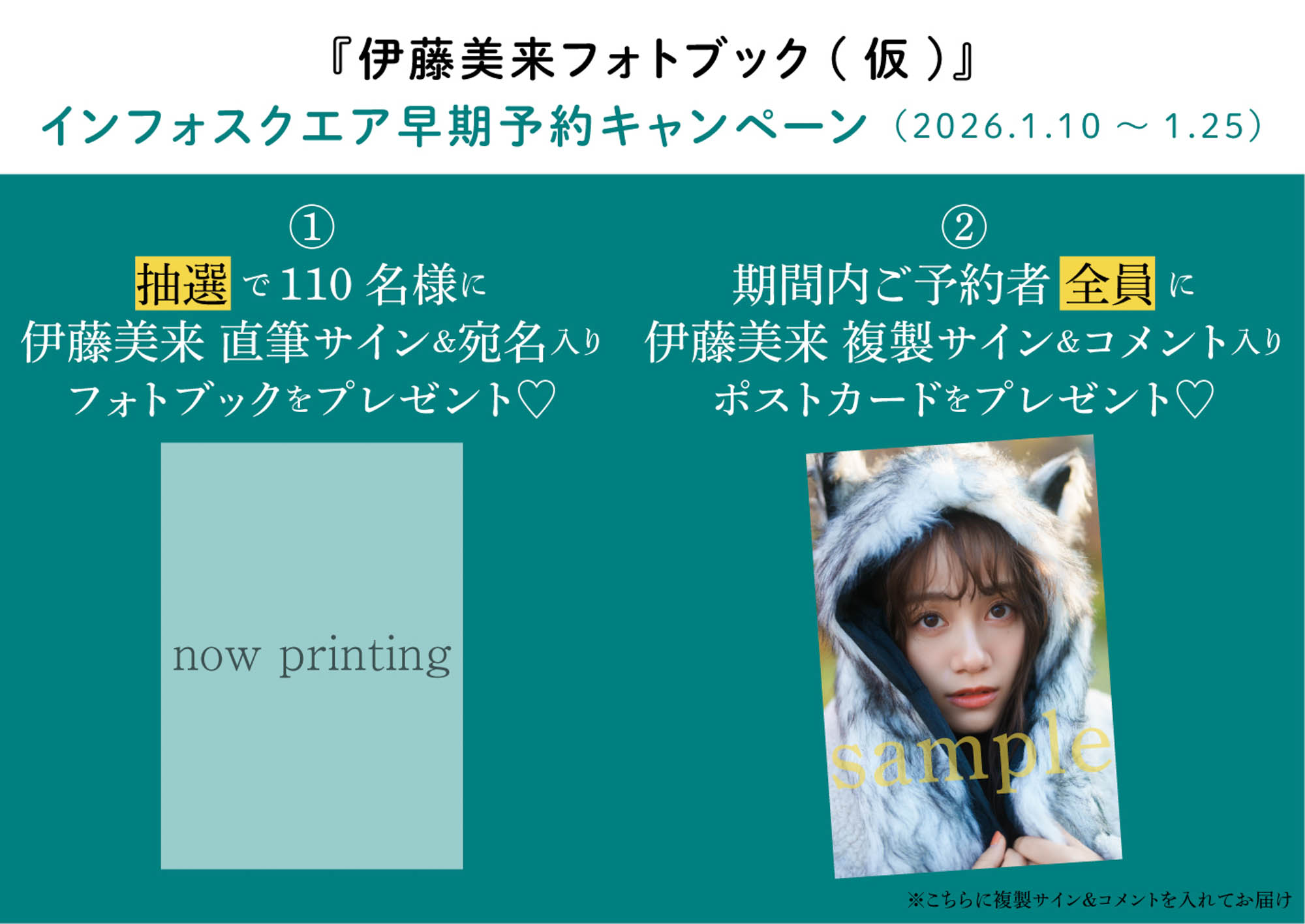 1月10日(土)~1月25日(日)にインフォスクエアにて予約した人を対象に、抽選で110人に直筆サイン&宛名の入ったフォトブックが当たるキャンペーンを実施。キャンペーンでは全員プレゼント企画として今回解禁されたオオカミのカットを使用したポストカードに複製サイン&コメントを入れて届けられる。