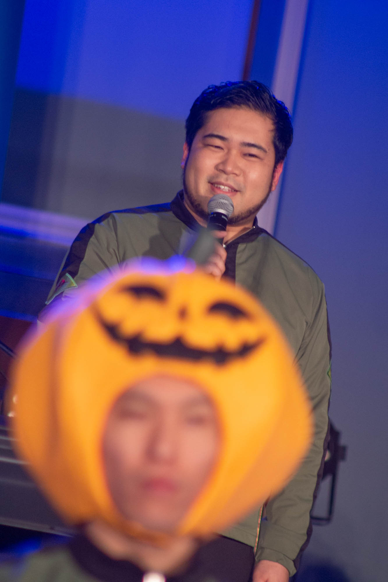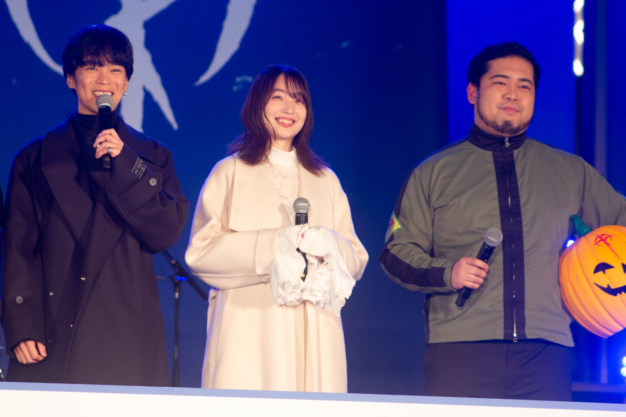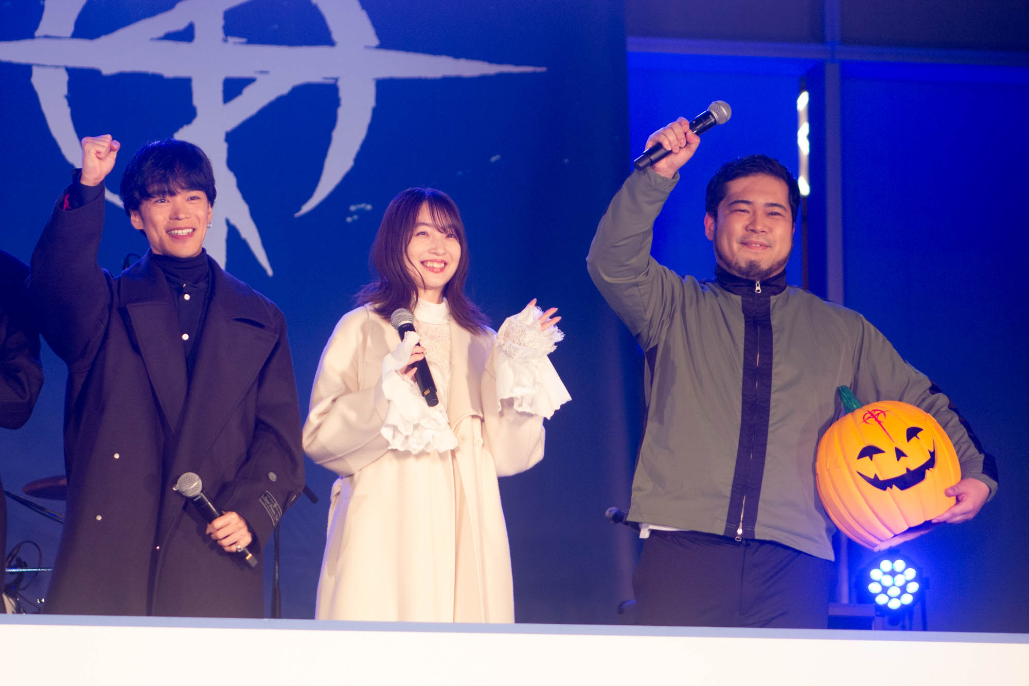 そんなアフレコの余韻に浸る間もなく、会場の大きなスクリーンには本作のプロモーション活動“閃光のセンコウ活動”の一環として、これまでSNSや街中で暗躍してきたカボチャ頭の“偽マフティー”の姿。さらにステージ横から本人が登場。「マフティーです」と挨拶しながら登場しつつ「私の正体、見せて差し上げましょう」とカボチャのマスクを外すと、その正体はお笑いコンビ・令和ロマンの松井ケムリであったことが明かされた。SNSを通じて様々な場所にゲリラ的に登場し、宣伝活動を行ってきたことに触れると「いい偽マフティーだったということですね」と胸を張った。また、カボチャのマスクについて感想を問われると「被り心地は最悪です(笑)」と即答し、「サイズがかなりタイトめで。あごがへこんだ状態でしゃべってる」と明かし、「視界がすごく狭くて、両サイドが見えてなくて前だけに集中できるんで、なんかモビルスーツに乗ってるみたいな気持ちになりました。むしろパイロットの気持ちになれました」と笑いを誘った。また、松井は「この『閃光のハサウェイ』はちょっと大人向きの作品になってるし、『逆襲のシャア』とか見たらもう結構すぐ楽しめるようになってますんで、昔からガンダム好きな人にも刺さりやすい作品かなと思いました」と感想を述べた。
