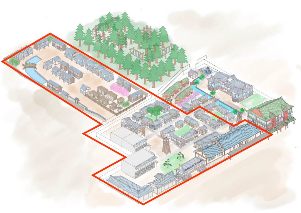 映画『レジェンド&バタフライ』や『大奥』などを手掛けた東映京都撮影所の美術スタッフがリアルな江戸時代の町並みを再現するほか、江戸時代の京都を肌で感じられる花魁道中のような演出や丁半博打などの体験型コンテンツ、町歩きしながら楽しめる食べ歩きスポット、江戸時代の建物の中で行われる華道のような文化体験などを展開し、感性を刺激する新しい大人の没入体験パークを目指す。また、夜の京都観光も楽しんでいただけるように、ナイト営業も開始する。