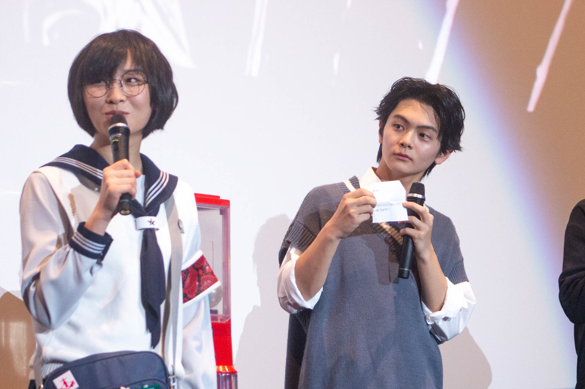 一方、SUZUKAは「できるのであれば何年もスマホなしで過ごしてみたい」と答え、実体験として「2日ぐらい山奥に行って、いろんな修行をしていたことがあって」と切り出すと、会場からは驚きの声が漏れた。その修行中は電波が全く届かない環境だったため、物理的に連絡が取れなかったようで「それで全然余裕でしたね。ある程度メンバーだったりとか、連絡取れないのなんで?ってなっていたと思うんですけど、2日は全然余裕でした」と振り返り、電波が届かない場所へプライベートで遊びに行くことがあるという河森監督に「一緒に行きましょう(笑)一緒に旅をしてみたい」と誘う場面も見られた。