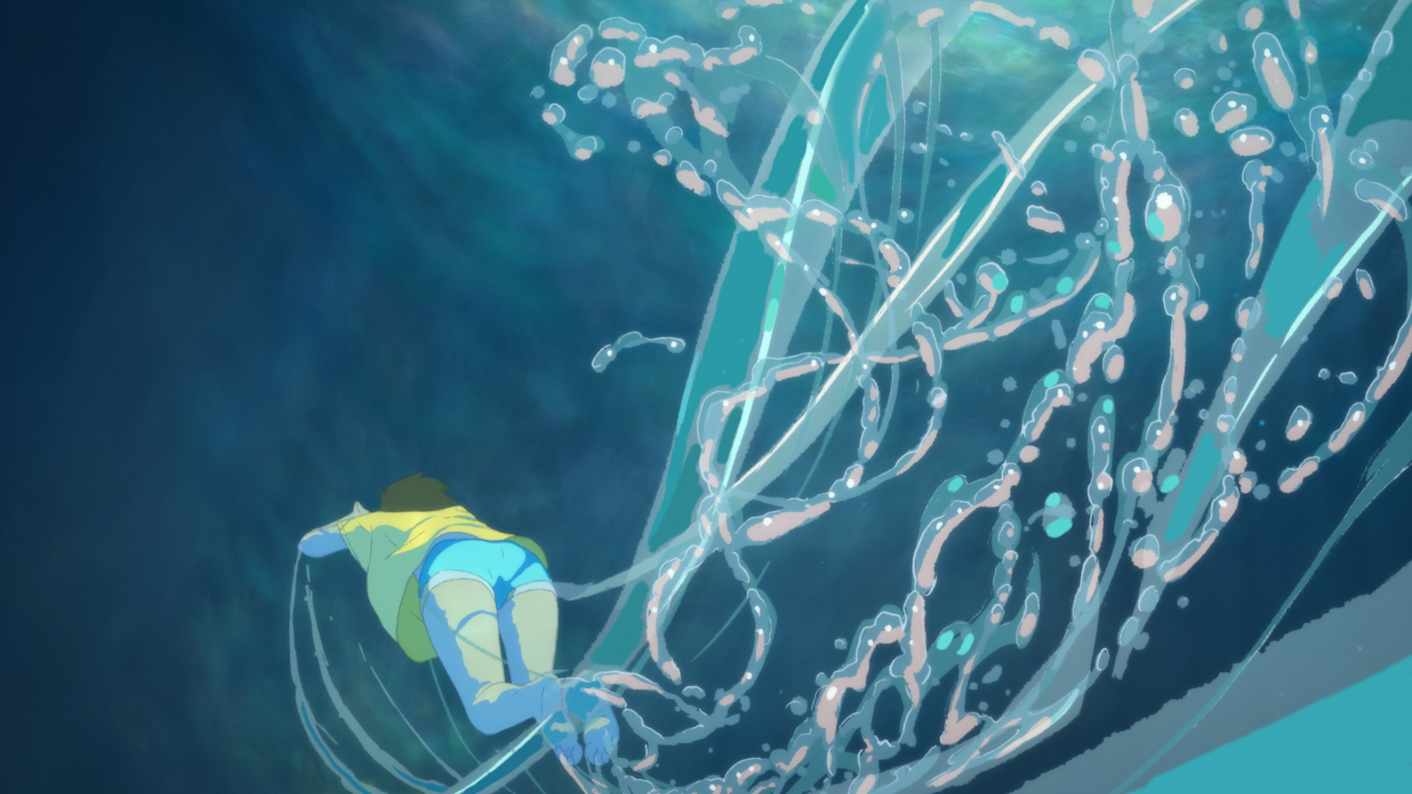 今回、第76回ベルリン国際映画祭コンペティション部門に正式出品され、世界的な注目を集めている本作より、光と色彩が画面を満たす圧巻の場面カットが一挙に公開された。東京から4年ぶりに地元へ戻ってきたカオル(CV:古川琴音)は、町の再開発によって埋め立てられた入江や無くなりつつある森など、変わり果てた“知らない景色”に戸惑いを覚える。一方、地元に残り続け、町の変化を見つめながら幻の花火<シュハリ>を作り続けてきた敬太郎(CV:萩原利久)と、再開発を推し進める市役所に勤務する敬太郎の兄・チッチ(CV:入野自由)。新たに解禁された場面カットには、そんな幼馴染三人が過ごす夏の終わりの2日間が凝縮されている。