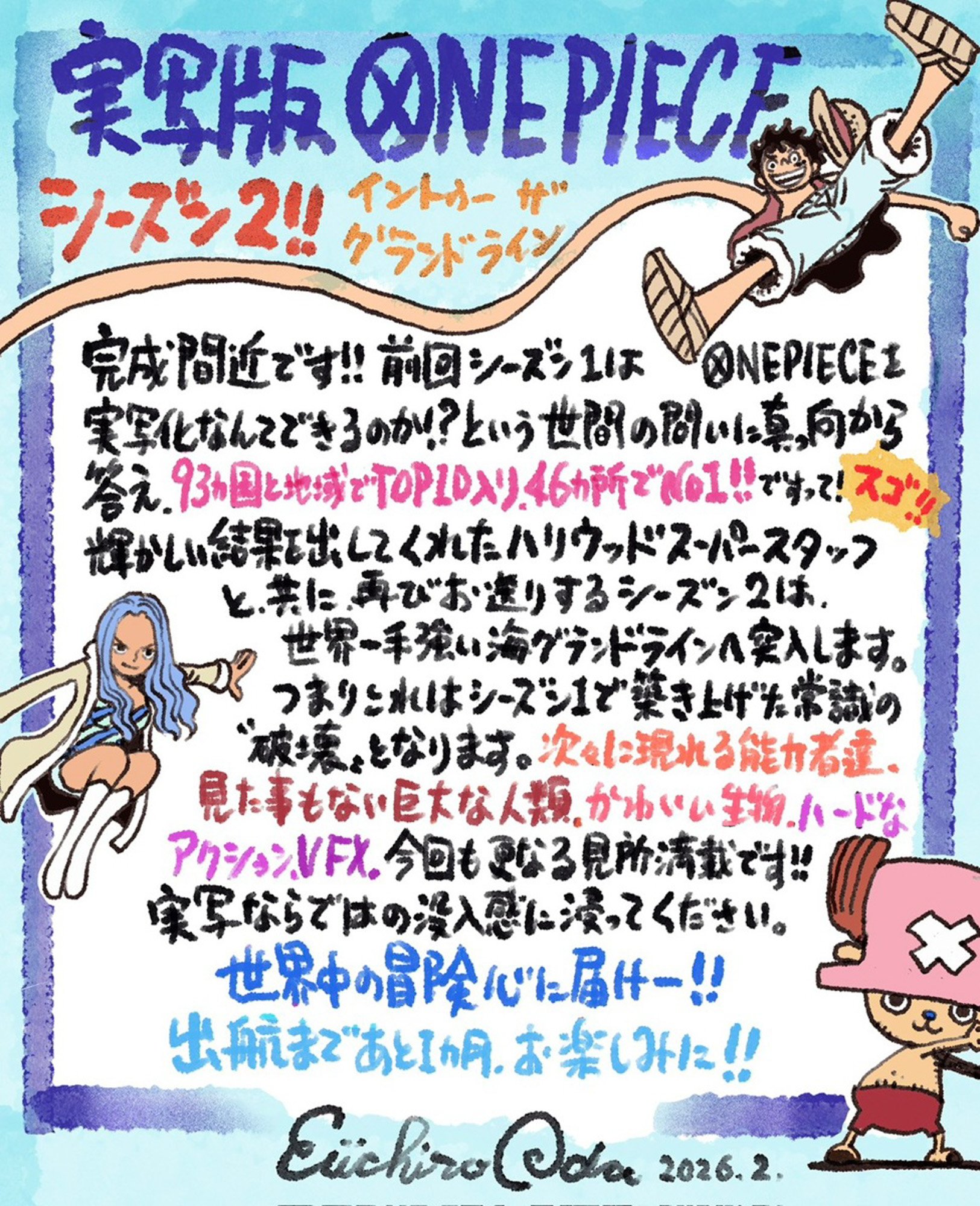 完成間近です!!前回シーズン1はONE PIECEを実写化なんてできるのか!?という世間の問いに真っ向から答え、93カ国と地域でTOP10入り、46カ所でNo1!!ですって!スゴ!!