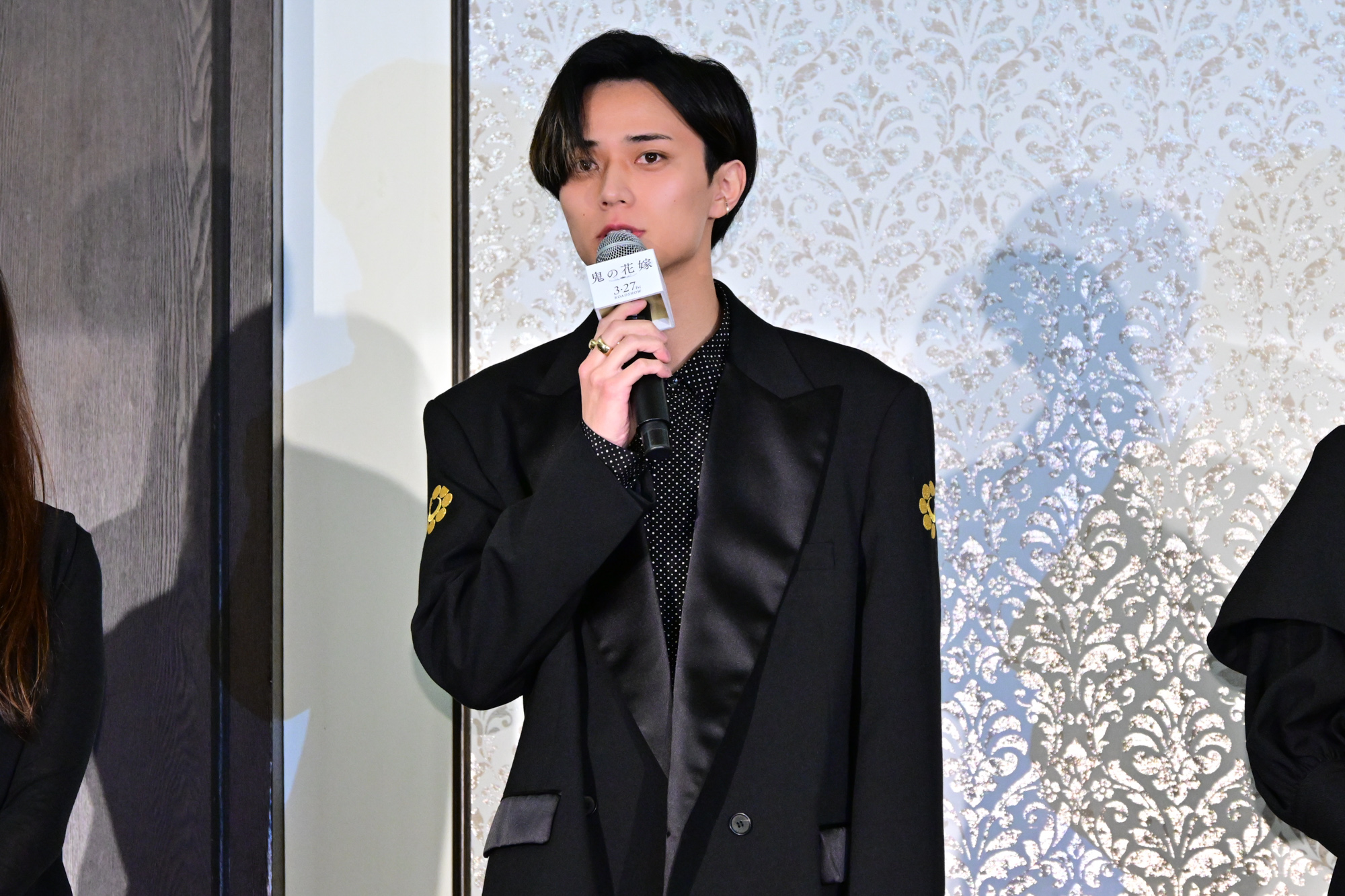 あやかしの頂点に立つ鬼の一族の次期当主で崇高なカリスマ性を持つ鬼龍院玲夜役の永瀬 廉、玲夜と運命の出会いを果たす女子大生・東雲柚子役の吉川 愛は、作品の世界観そのままに、レッドカーペットが敷かれた結婚式場の大階段に、劇中衣装を着て登場。W主演を務める永瀬は「今日が『鬼の花嫁』初イベントということで、皆さんに本作の魅力を少しでもお伝えすることができればと思います」と挨拶。吉川も、「本日は短い時間にはなりますが、よろしくお願いいたします」と挨拶し、製作報告会が開始した。