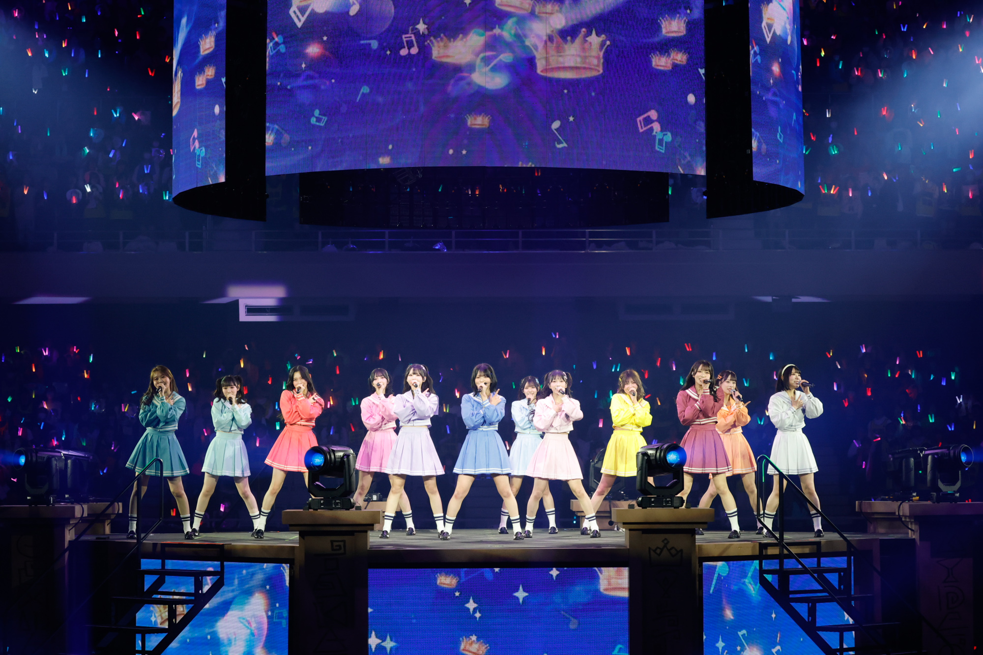 後半ブロックでは生バンドが登場。エレキギターを手にした江角にスポットライトが当たり、彼女がパワーコードを力強くかき鳴らすと盛大な歓声が上がる。その編成のまま『無謀人』が披露され、『超孤独ライオン』では江角のエッジィなギターソロが炸裂した。その後も≒JOYは人気曲を生バンドの演奏をバックに披露していく。天野香乃愛がセンターを務めた4thシングルの表題曲『電話番号教えて!』では、メンバーがキュートな笑顔を振りまいた。