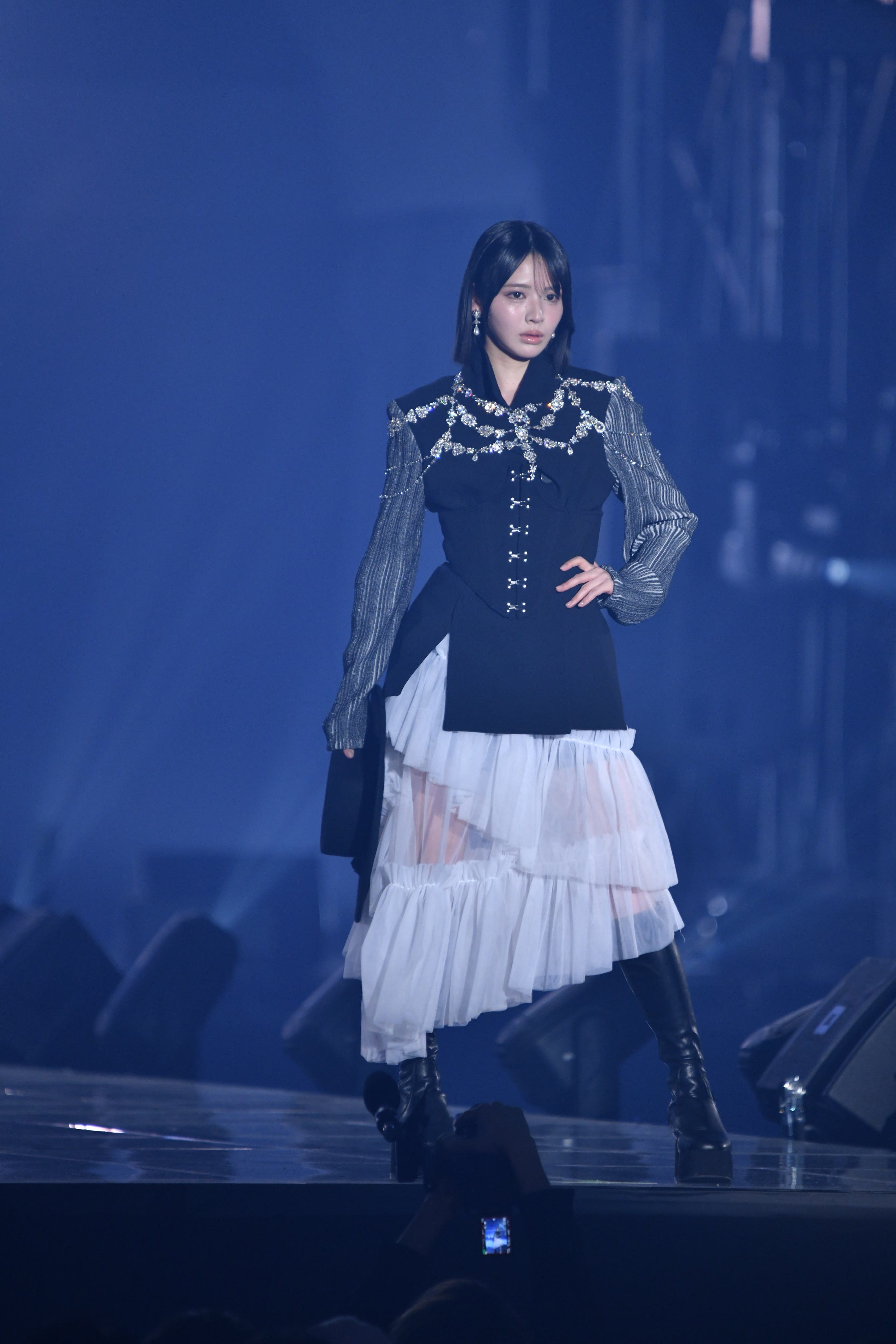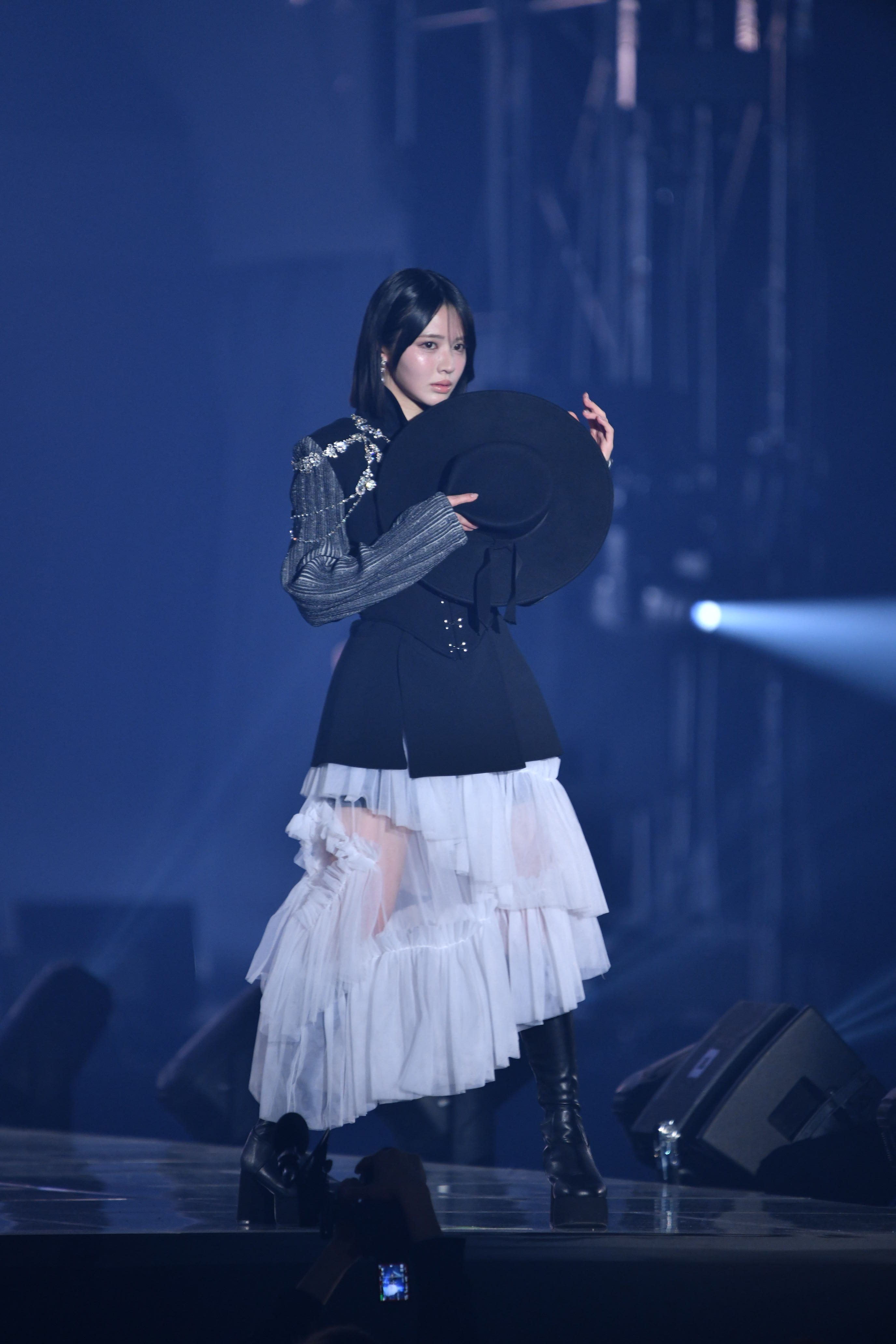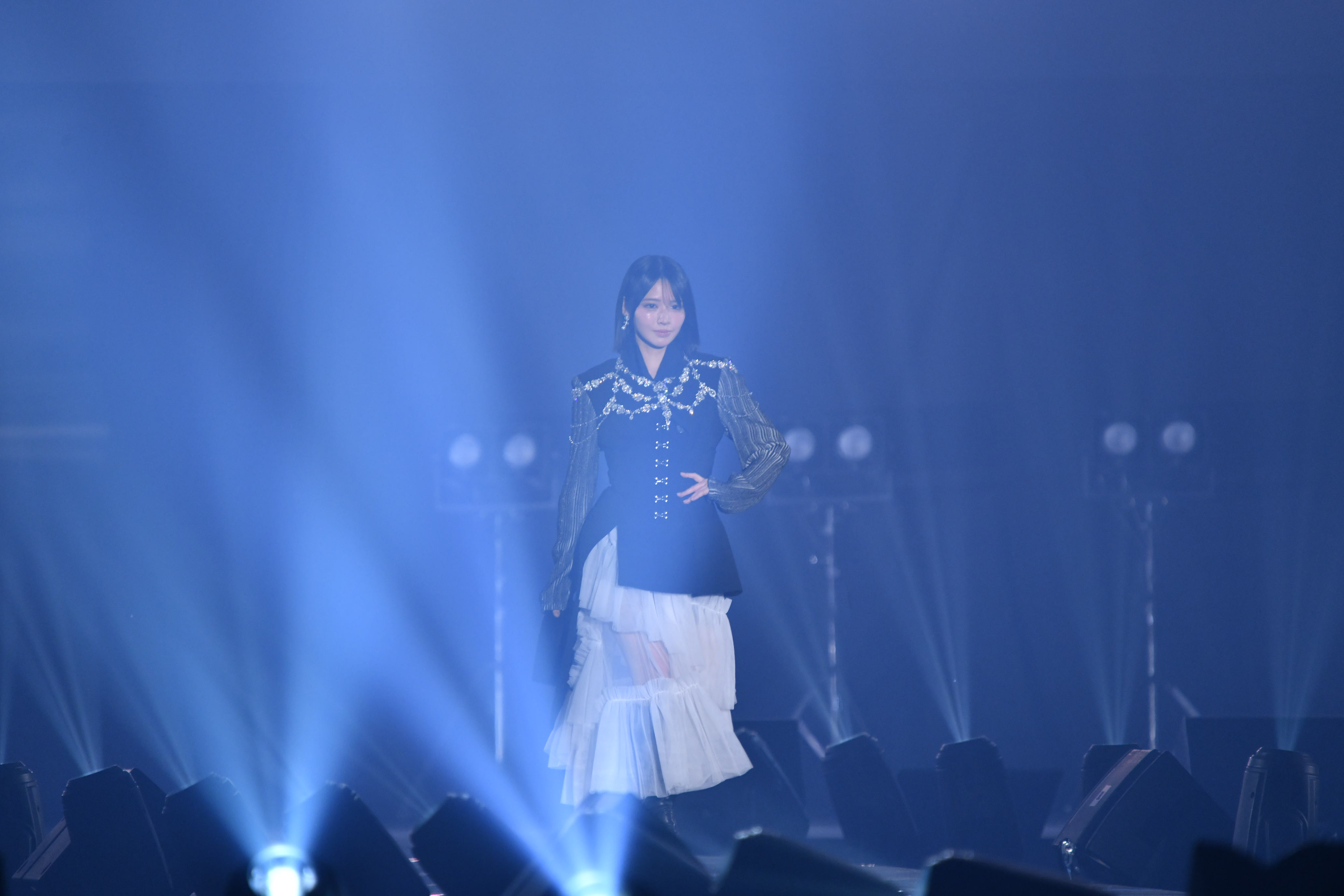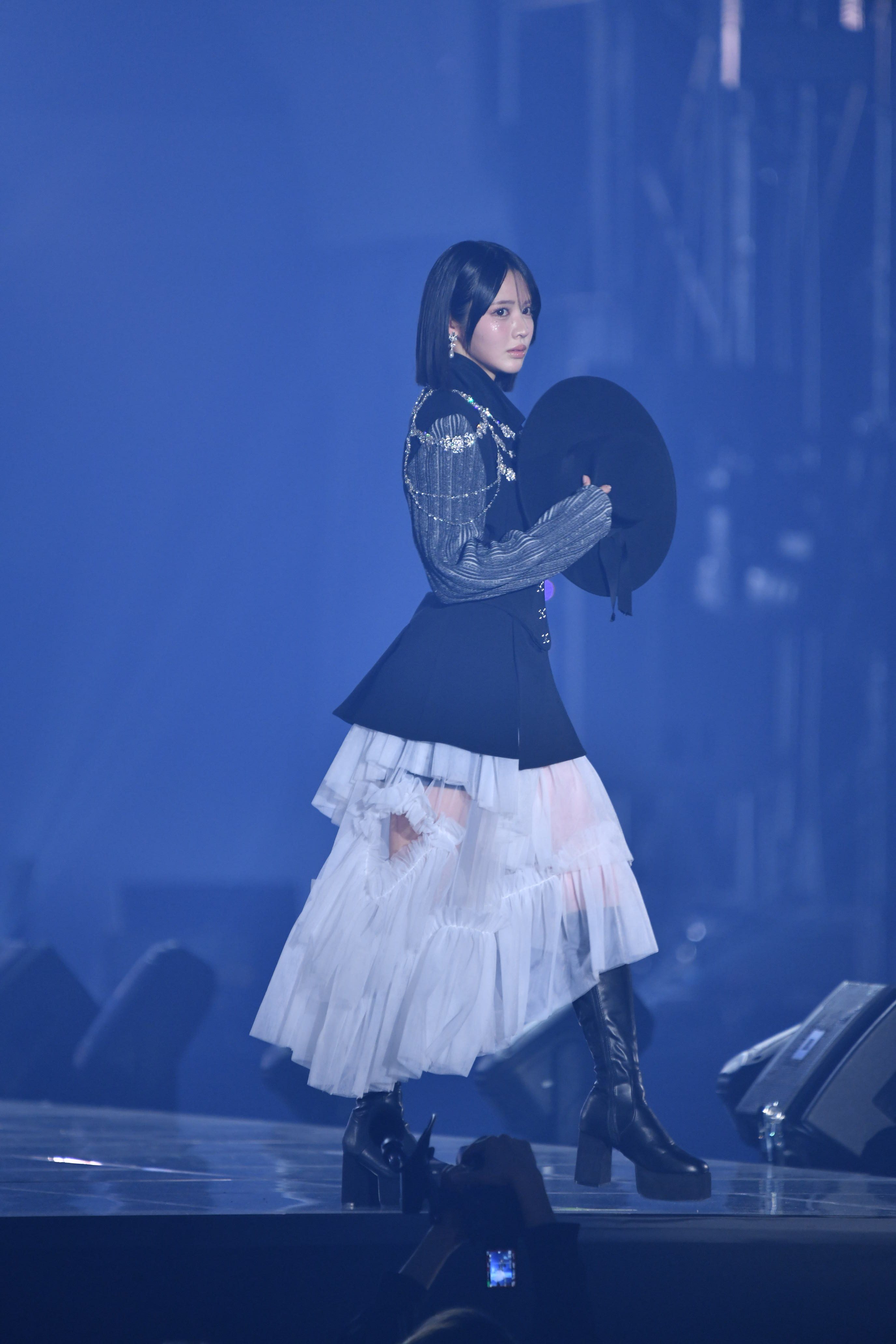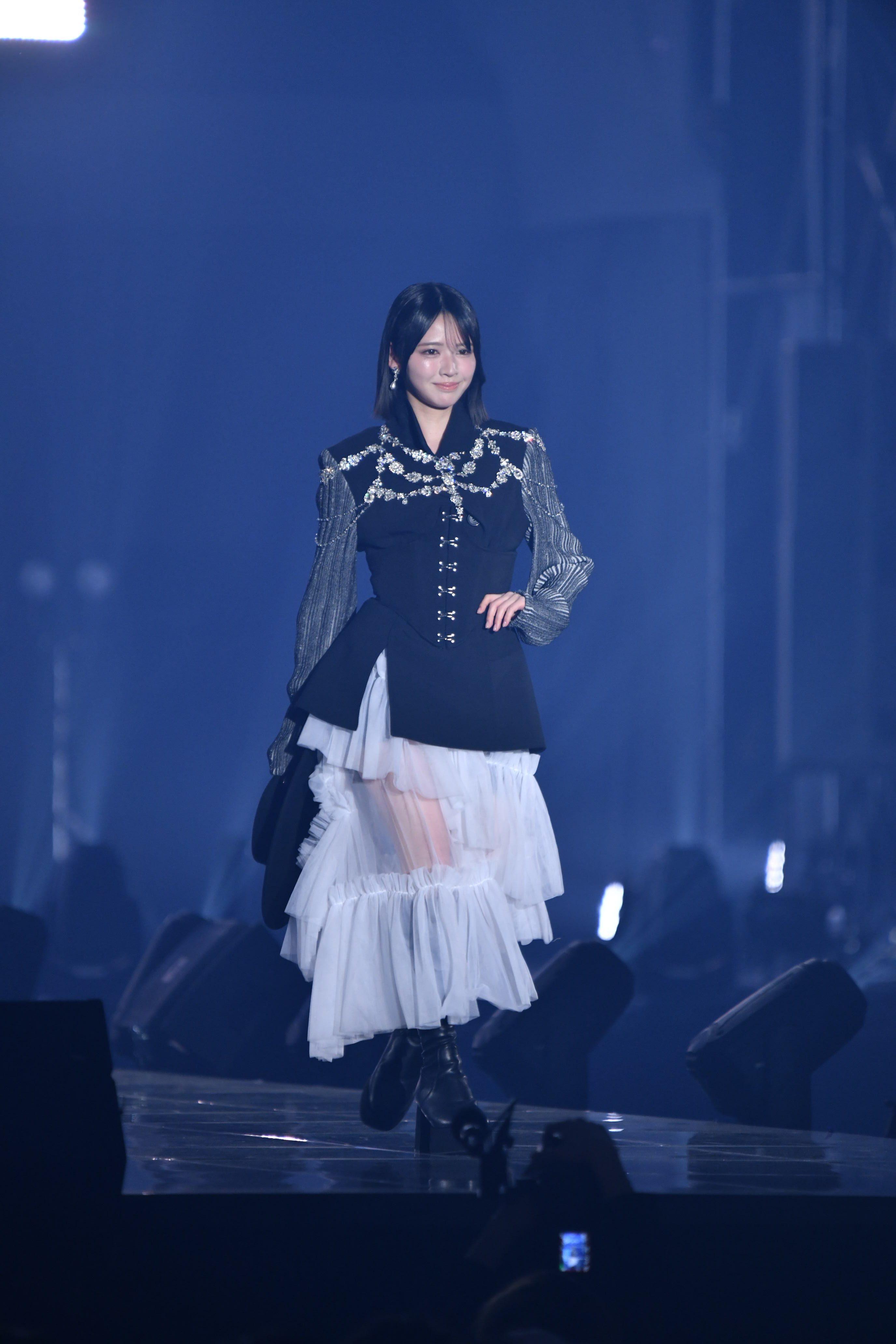 ランウェイのトップバッターを切ったのは、FRUITS ZIPPERの鎮西寿々歌。ビジューが輝く黒ジャケットに、ボリューム感のある白のティアードスカートを合わせた装いを披露した。大きなハットを手に、クールな表情と優雅なウォーキングで観客を魅了した。
