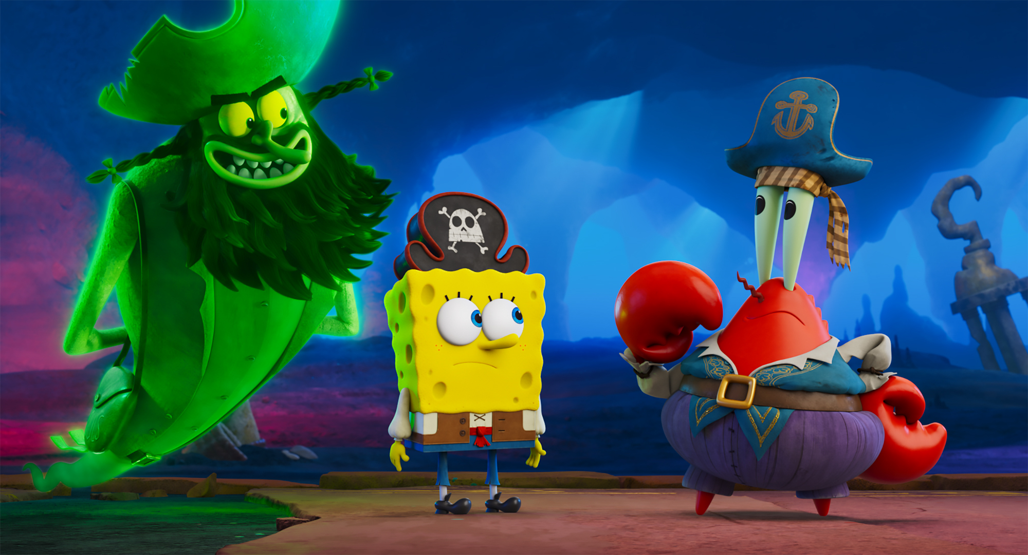 1999年にアメリカのアニメーター、ステファン・ヒーレンバーグによって生み出されたキャラクター、スポンジ・ボブ。海の底にある町ビキニタウンでペットのカタツムリ・ゲイリーとともにパイナップルの家に暮らす、とにかくポジティブでハイテンションな海綿だ。スポンジ・ボブの親友であるヒトデのパトリック、隣人で同僚でもあるタコのイカルド、尊敬するボスであるカニのカーニさんなど、個性あふれるキャラクターたちの笑いと騒動が絶えない日々を描いた「スポンジ・ボブ」シリーズは放送開始以来、そのユーモアと独特な世界観でファンたちを魅了し、これまでに180か国以上で放送される大人気シリーズへと成長した。そんな長年にわたり海の底から世界中へ笑顔を届けているスポンジ・ボブの最新作では劇場版でよりビッグになったスポンジ・ボブが、仲間とともに呪われた海賊を救う史上最大の大冒険が描かれる。